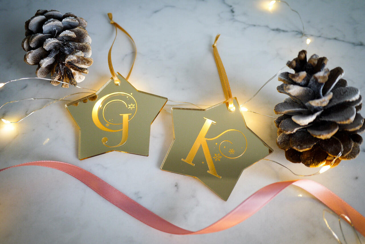 Peegelakrüülist kuldsed ja hõbedased tähekesed, millele saate lisada initsiaali. Paela värv on vastavalt tähekesele kuldne või hõbedane. Sissegraveeritud osad kumavad mõnusalt läbi ning jäävad kuusel eriti efektsed.