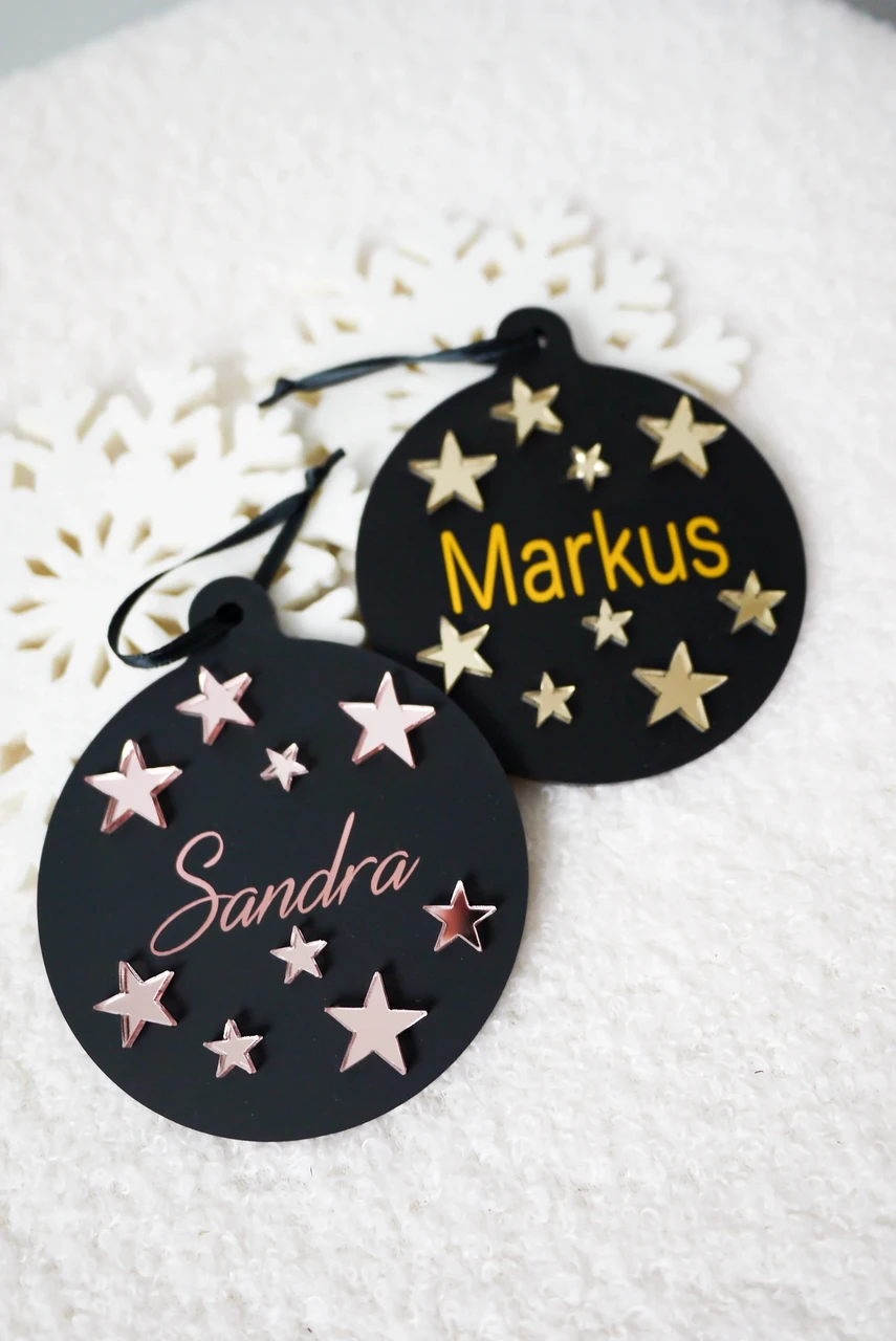 Matist mustast akrüülist ehted, millel on ilusad peegelakrüülist tähekesed. Saate ehtele lisada endale meelepärases värvis kleebisega nime. Valikus on must ja valge pael.