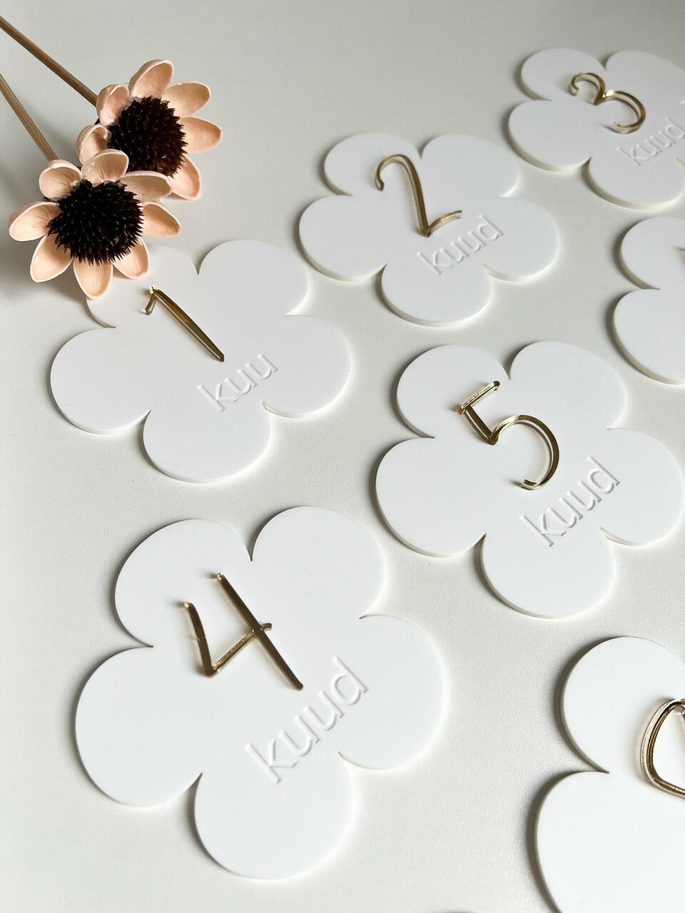 Lillekesed on valmistatud valgest akrüülist ning peale saab numbrit valida kas kuldsest või hõbedasest peegelakrüülist.