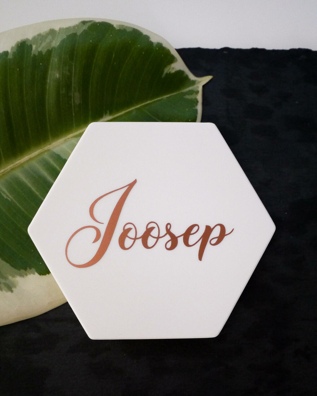 Ilus kuusnurkne klaasialus, millele saab lisada nimed või mõne muu sõnumi. Tore kingitus või mälestus ka mõnelt ürituselt. Valmistatud tugevast kunstkivist (Corian®) ja põhja alla lisatud pehmenduseks silikoonpadjad. Läbimõõt 9,5cm