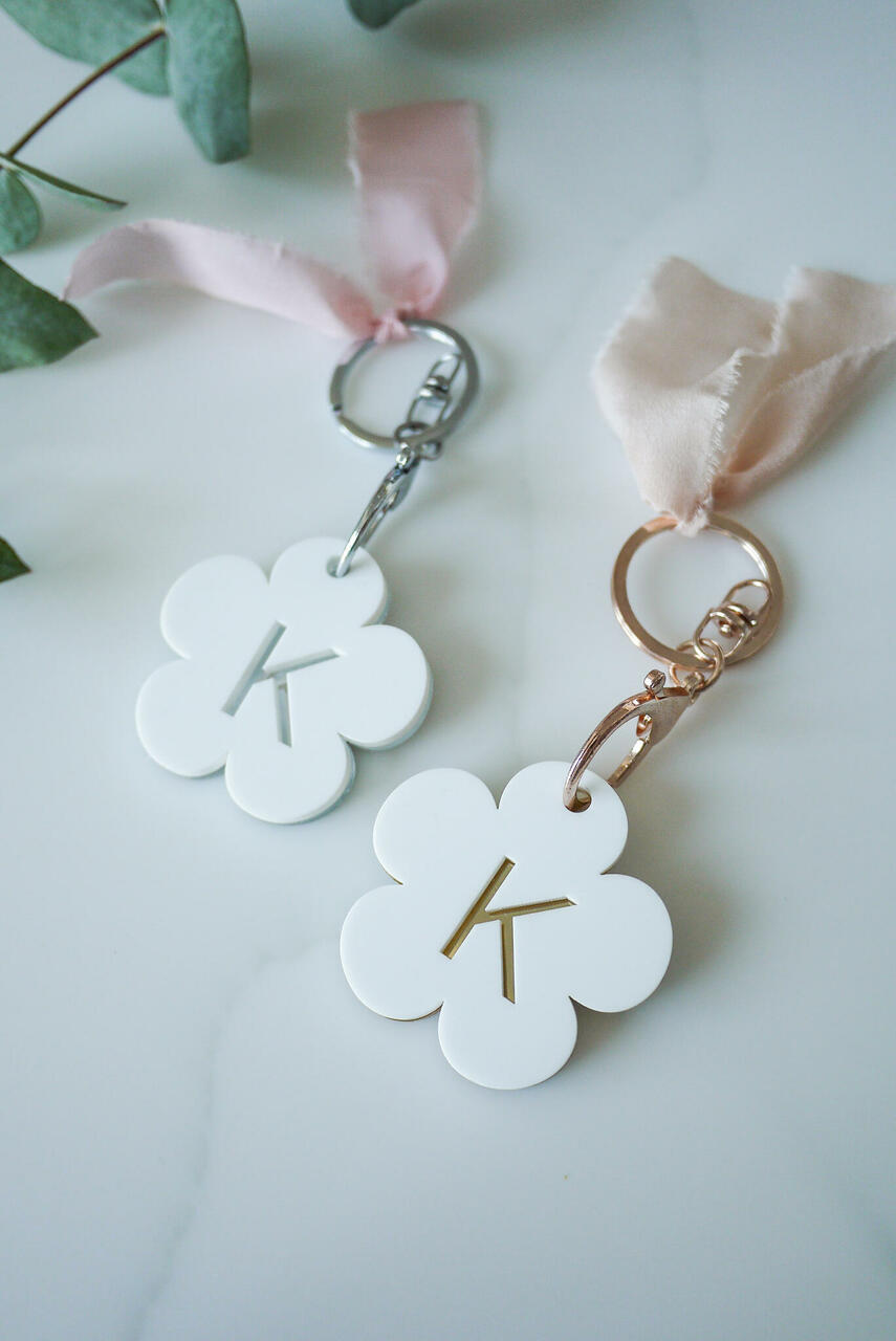 Valgest akrüülist võtmehoidja, mille sees kuldne või hõbedane initsiaal. Juurde saate lisada endale meelepärase võtmerõnga ning paela.