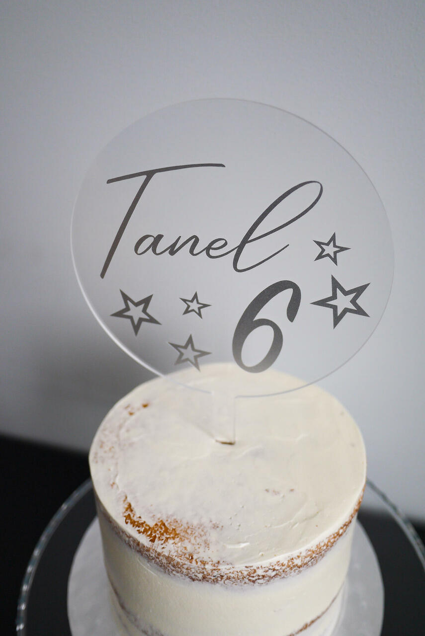 Akrüülist topper tortidele. Läbimõõt 14cm ja pulga pikkus 11,5cm. Valikus on läbipaistev ja tuhm-matt topper.